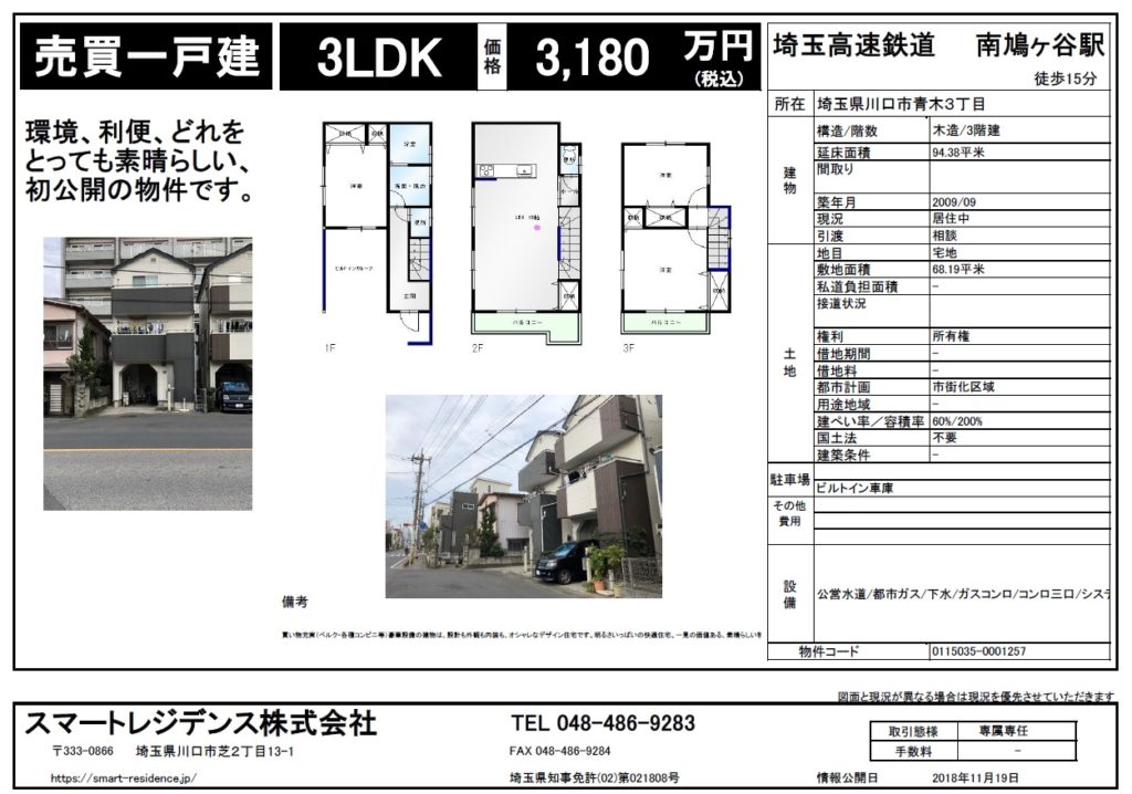 木造3階建 延べ床面積 94.38㎡ 土地面積 68.19㎡